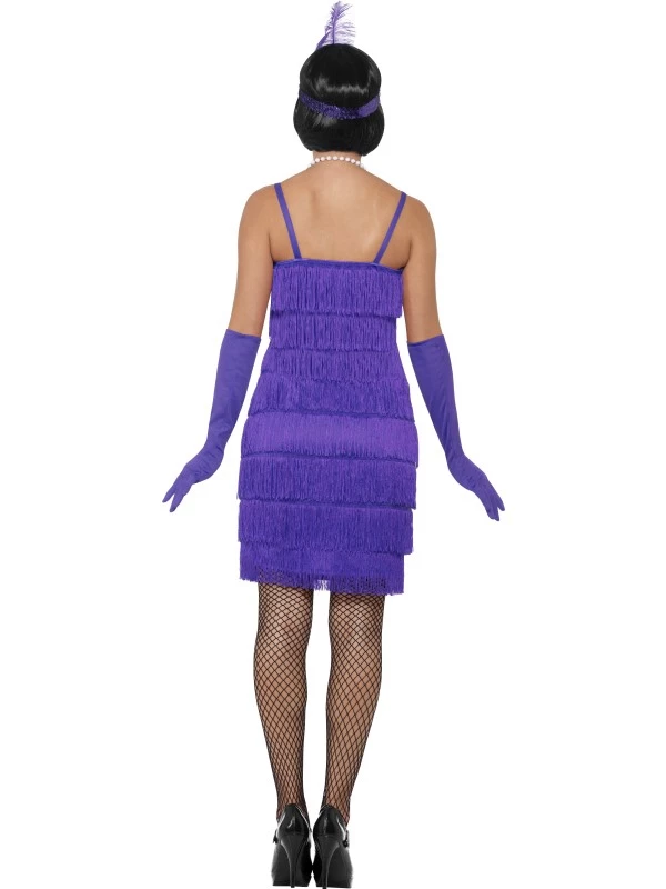Paarse1920’s Flapper Verkleedkleding Dit leuke paarse kostuum bestaat uit een jurkje met franjes, paarse handschoenen en een leuke hoofdband met veer. De overige accessoires om uw look af te maken verkopen we los.
