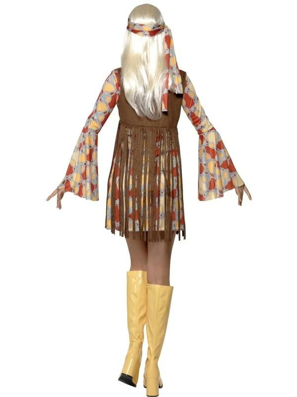1960’s Groovy Baby Dames Kostuum. Inbegrepen is de korte min jurk met lange uitlopende mouwen en gilet met lange franjes