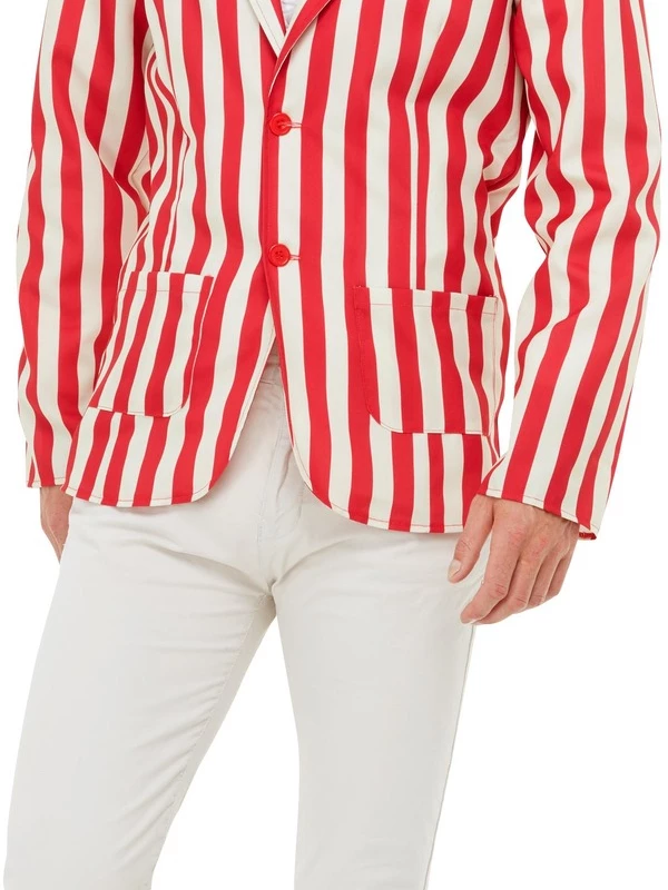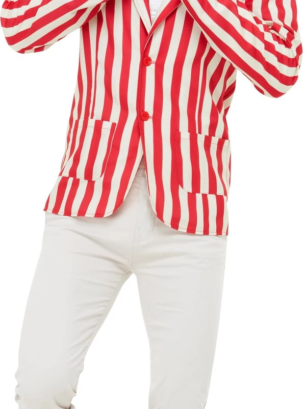 Terug naar de jaren Twintig met dit geweldige 20s Barber Shop Kostuum, bestaande uit het rood/wit gestreept jasje, hoed en strik. Draag dit jasje op een eigen witte broek en je bent klaar voor het feest.