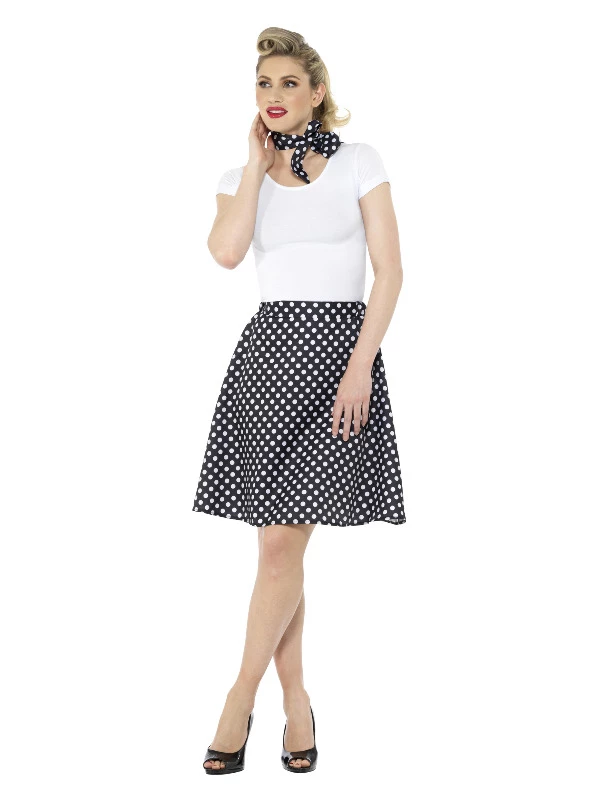 Terug naar de jaren vijftig met deze geweldige zwarte 50s Polka Dot Rok met bijpassend sjaaltje. Ook verkrijgbaar in kindermaten.