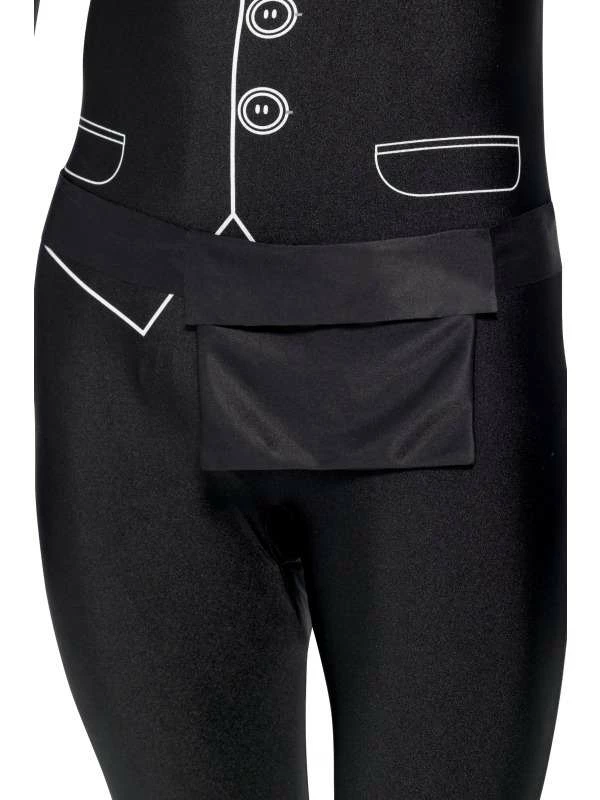 Beschoten Gangster Halloween Morph Suit Second Skin Kostuum. Zwarte Second Skin Morph Suit met Pak print en rode bebloedde kogelgaten. De morphsuits zijn gemaakt van stretch lycra, waardoor het zich naadloos aanpast aan ieder figuur. Er zit een openening onder de kin en bij de gulp en inclusief heuptasje.