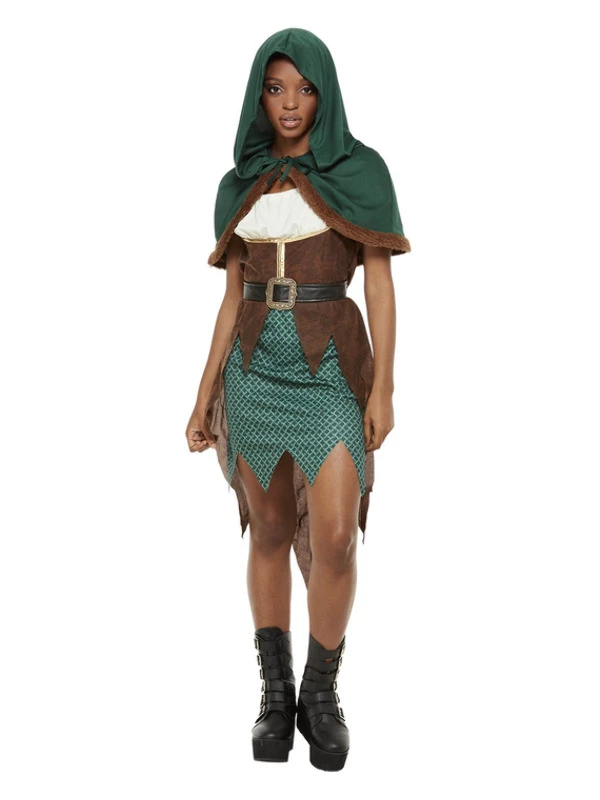 Deluxe Forest Archer-kostuum bestaande uit de jurk & cape met capuchon. Het enige wat nog mist is een pijl en boog . Perfect voor Carnaval of themafeest.