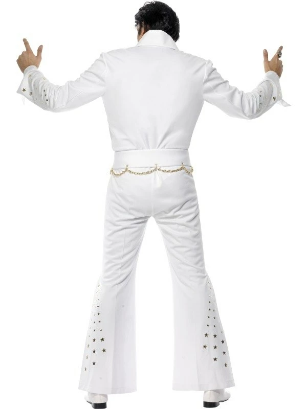Elvis American Eagle Heren Verkleedkleding. Inbegrepen is de mooie witte jumpsuit met steentjes en mooi bewerkte riem en de rode sjaal. Top kwaliteit kostuum.