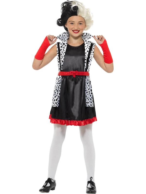 Bekend van de film 101 Dalmatiërs, Evil Little Madame Kostuum, bestaande uit het jurkje met aangehecht jasje en de handschoenen. Maak de look compleet met de bijpassende pruik en panty.