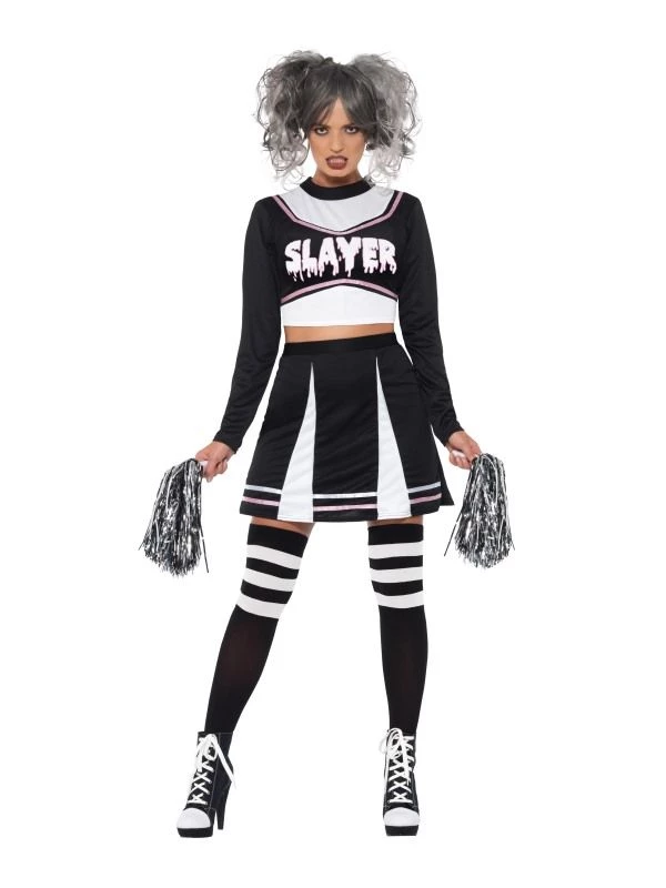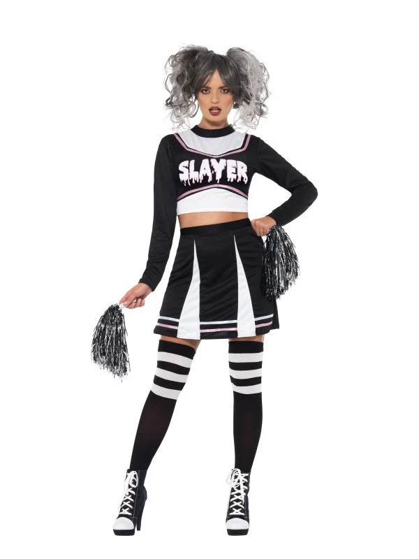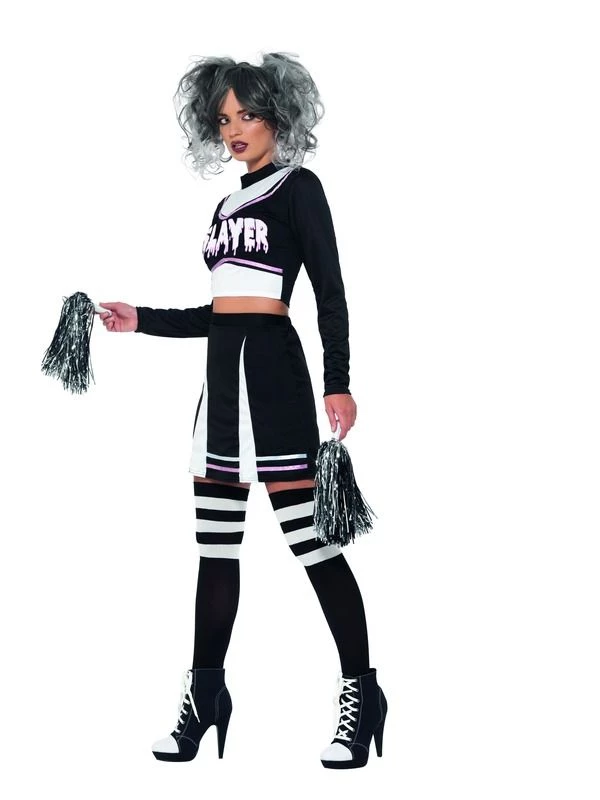 Fever Gothic Cheerleader Kostuum, bestaande uit de top met rokje en pom poms. Maak de look af met de bijpassende pruik, kousen en schmink en ontvang leuke kortingen.