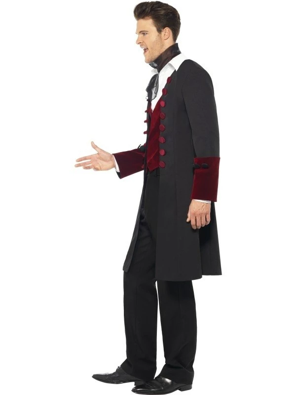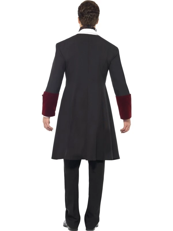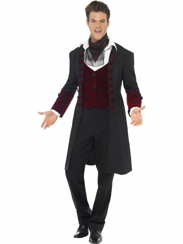 Fever Gothic Vampire Vampieren Kostuum Heren Halloween Kostuum. Inbegrepen is de zwarte jas, de spencer en de cravate. Draag het met een zwarte broek en je outfit is compleet. We verkopen vampieren schmink en tanden los.