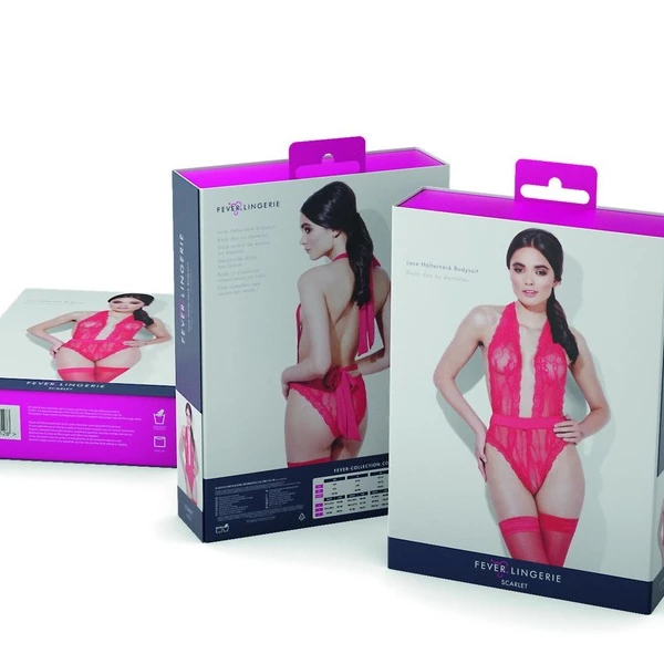Prachtige rode kanten Fever Scarlet, Sweetheart Halterneck Bodysuit. Maak het setje af met bijpassende Hold-Up Kousen.