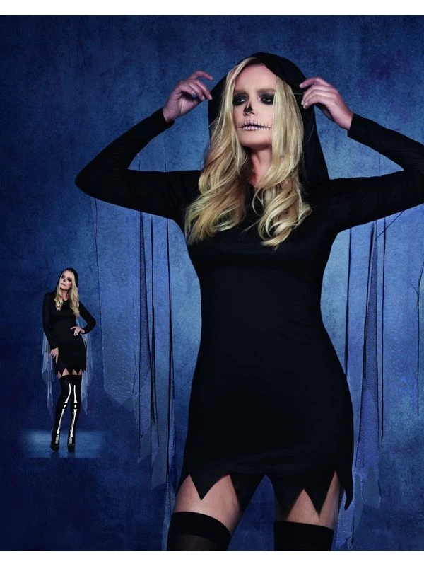 Fever Sexy Reaper Kostuum, bestaande uit het sexy zwarte jurkje. Maak de look af van bijpassende handschoenen en kousen en je bent klaar voor jouw Halloween/Horror feestje.