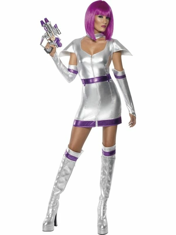 Fever Space Cadet Dames Kostuum. Inbegrepen is de sexy zilveren mini jurk, riem, aparte mouwen/ handschoenen en zilverkleurige laarskappen. De pruik verkopen we los.