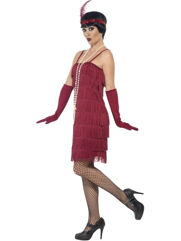 Flapper Jurk in de kleur Burgundy Red, dit kostuum bestaat uit een kort jurkje met hoofdband en handschoenen. Leuk voor een 1920’s Party. Kijk hier voor bijpassende 1920’s accessoires en pruiken.