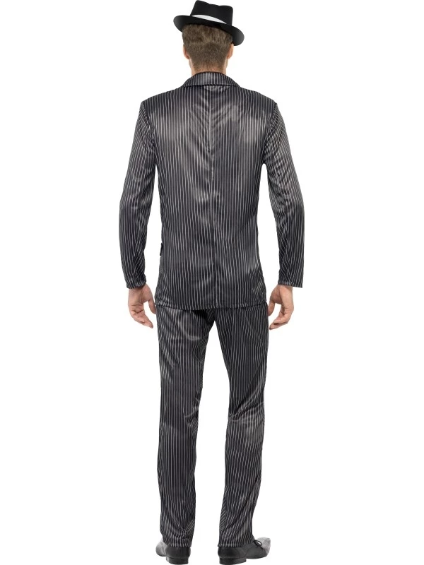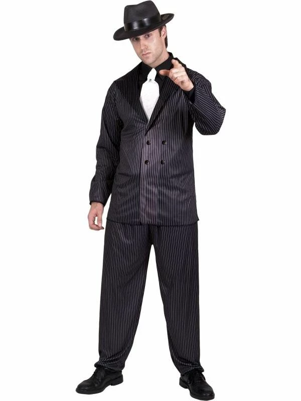 Gangster Heren Verkleedkostuum, bestaande uit het krijtstreep pak (jas en broek), voorkant shirt en stropdas. Maak de look compleet met bijpassende accessoires.