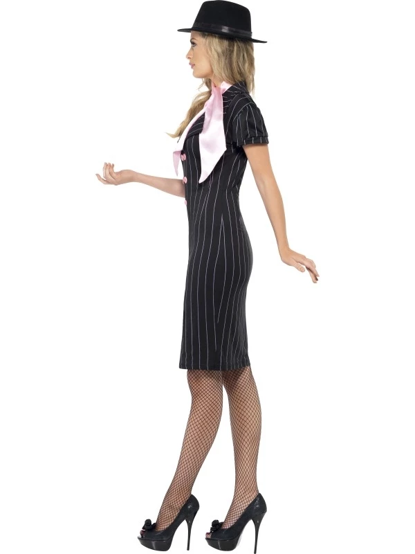Gangster’s Moll Dames Verkleedkostuum. Zwarte Krijtstreep Jurk (Pencil Dress) met roze knopen en roze sjaal. De zwarte gangter hoed verkopen we los.