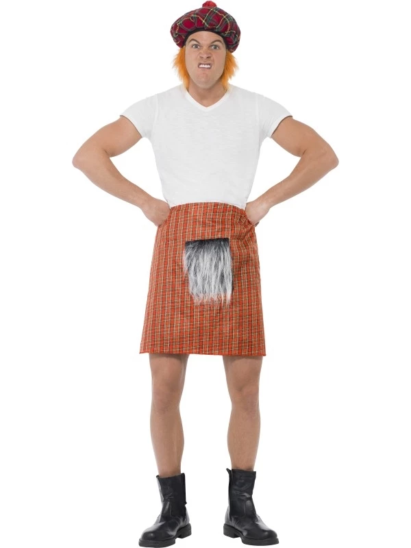 Grappige tartan (geruite, wollen stof, waar de Schotse kilt van wordt gemaakt) kilt met daaruit wat overtollig haar voor een extra grappig effect. Leuk voor vrijgezelllenfeesten, carnaval en andere themafeesten. Maak deze verkleedkleding af met een bijpassende hoed.