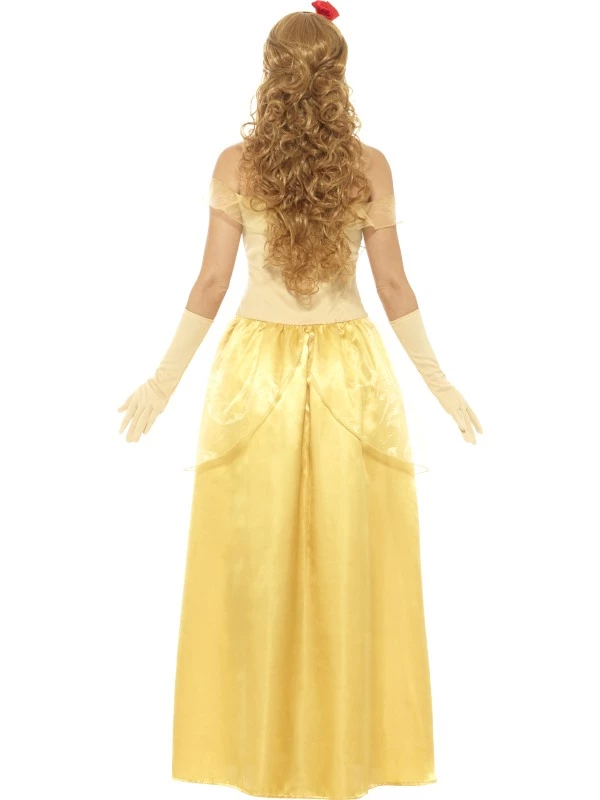 Golden Princess Kostuum, bestaande uit de prachtige lange jurk met handschoenen en hoofdband. Maak de look compleet met bijpassende pruik die hieronder aangegeven staan.