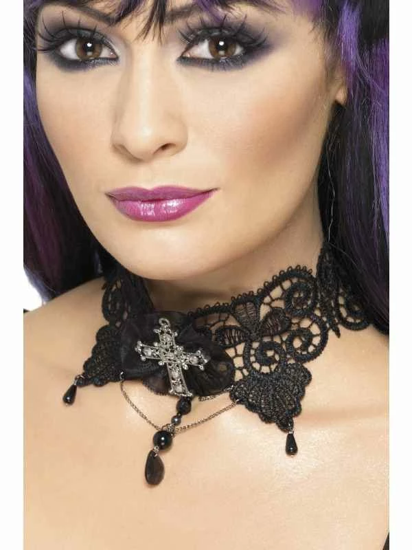 Web Omschrijving: Gothic Lace Choker, Black, Ornate with Jewelled Cross