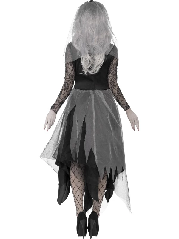 Weet je nog niet wat je aan moet trekken naar het Halloween feest? Verbaas iedereen met dit spannende Graveyard Bride Halloween Kostuum. Het kostuum bestaat uit een zwarte jurk met kanten mouwen en een grijs – zwart gelaagde rok en een zwarte haarband met rozen. Ook een bruidsboeketje, zwarte netpanty en schmink setje kunt u bij ons bestellen, naast vele andere Halloween accessoires.