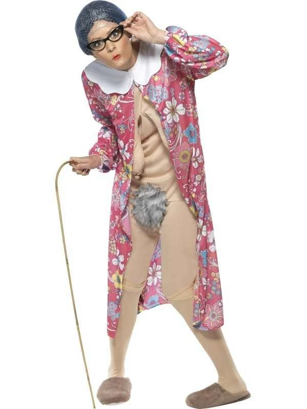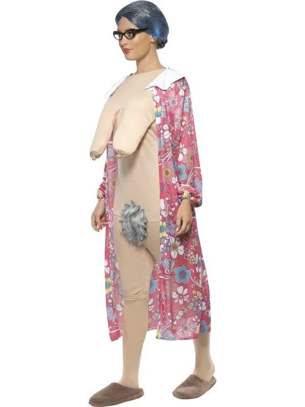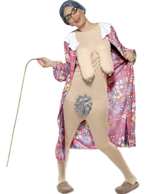 Gravity Granny Oma Kostuum, bestaande uit de “naakte” Bodysuit met Ochtendjas. Maak de look compleet met bijpassende accessoires.