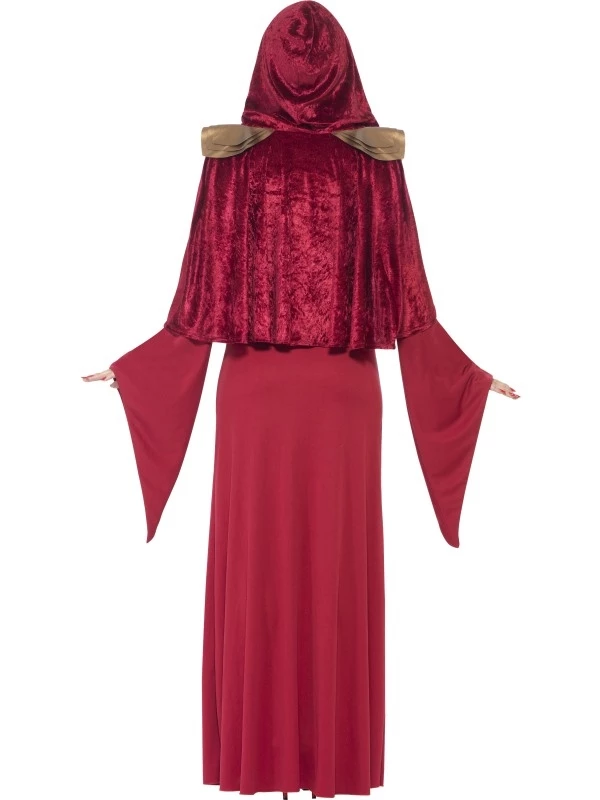 High Priestess Kostuum, bestaande uit de lange rode jurk met lange uitlopende mouwen, rode fluwelen cape met capuchon en bruinkleurige riem. Maak de look compleet met bijpassende accessoires.