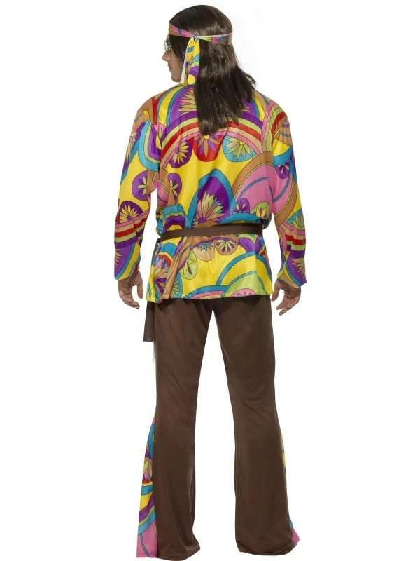 Hippie Gekleurd Heren Verkleedkleding. 1970’s kostuum met gekleurd shirt, bruine broek met wijde fel gekleurde pijpen, riem en haarband. De pruik verkopen we los in onze webwinkel.