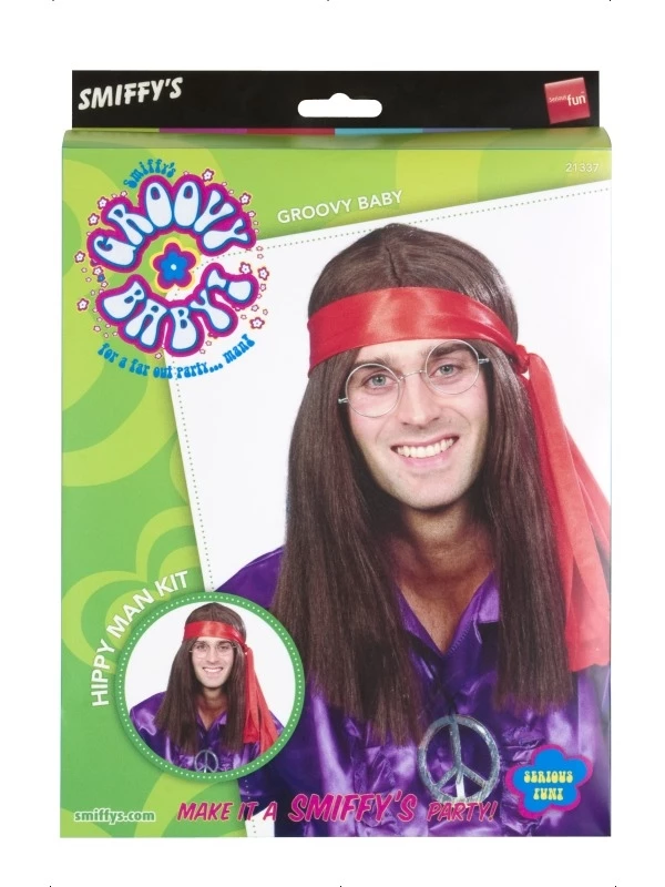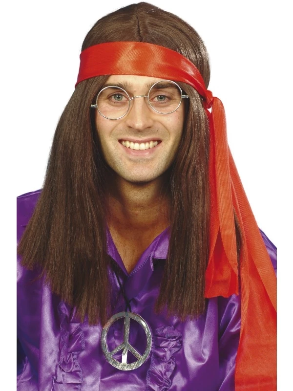 Leuk Hippie Heren Verkleedsetje 4- Delig met Bruine lange stijle pruik, rode haarband, bril en ketting met peace teken. Leuk voor je 60’s 70’s hippie outfit verkleedkleding.