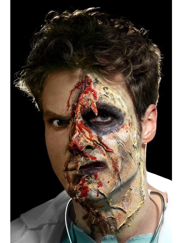 Maak de gruwelijkste horror zombie looks met dit Horror Zombie Vloeibare Latex Make up setje. U krijgt 4 verschillende kleuren met make up, 4 sponsjes en instructies. Maak af met extra nepbloed.