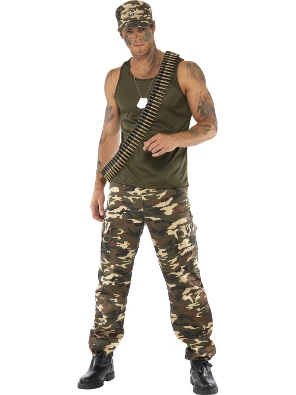 Stoer Camouflage Leger Carnavalskostuum. Khaki Camo Camouflage Heren Leger Kostuum met Shirt en camouflage broek. De leger accessoires verkopen we los.