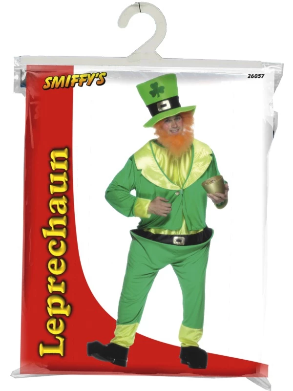 Leprechaun Kostuum, bestaande uit een groene jumpsuit met jasje hoed en baard.