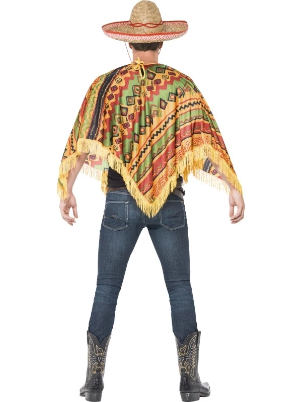 2-delig Mexicaanse Poncho Verkleedset. Inbegrepen is de gekleurde poncho en de zwarte snor. De hoed en andere accessoires verkopen we los.