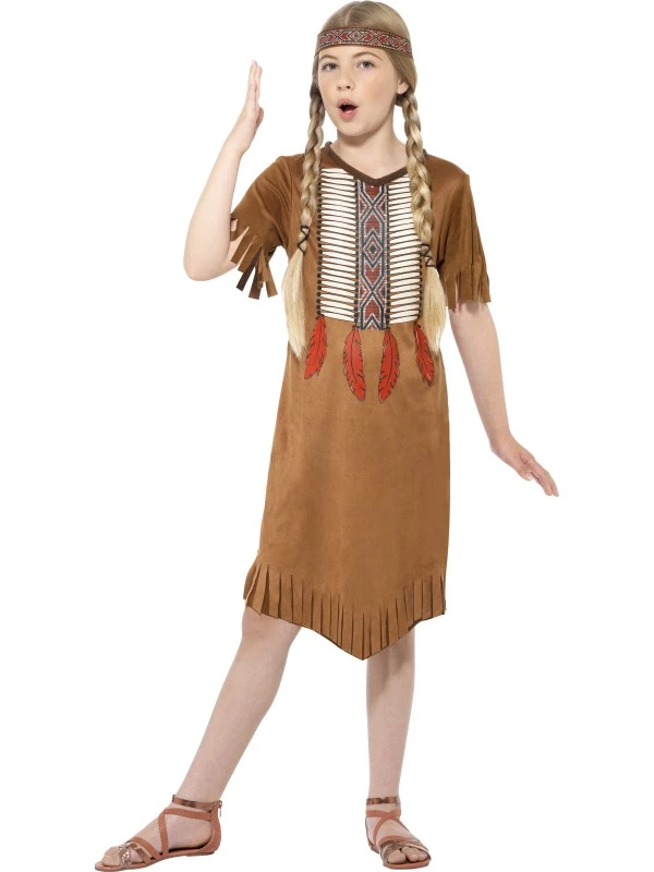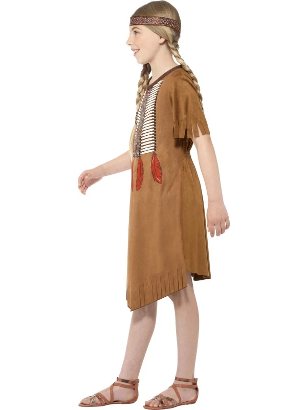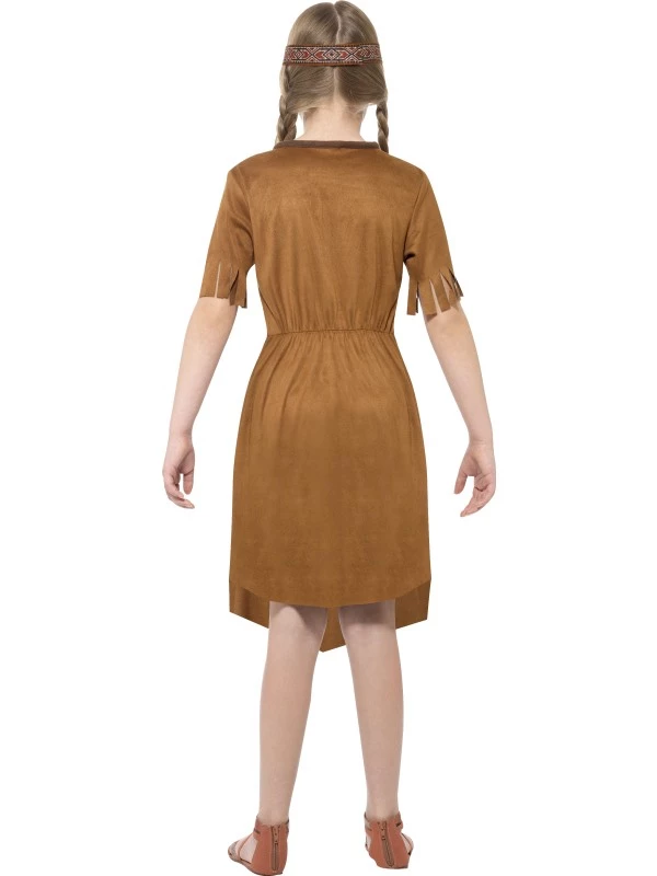 Een te leuke Native American Inspired Girl kostuum, bestaande uit een bruine jurk en een haarband om het kostuum helemaal af te maken.