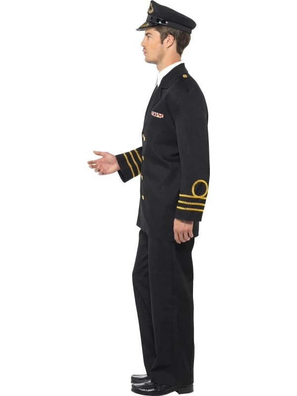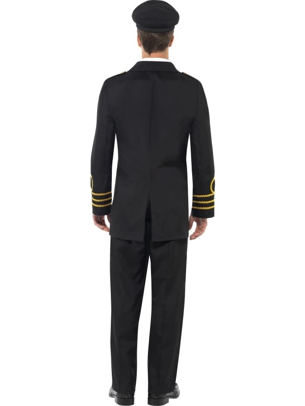 Navy Officier Heren Verkleedkostuum. Inbegrepen is het zwarte kostuum: de broek en het jasje met shirt en de hoed. Compleet kostuum. Leuk voor Carnaval en andere themafeesten.