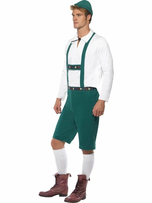 Oktoberfest Heren Verkleedkleding. Inbegrepen is de groene lederhosen met bretels, het witte shirt en het hoedje.