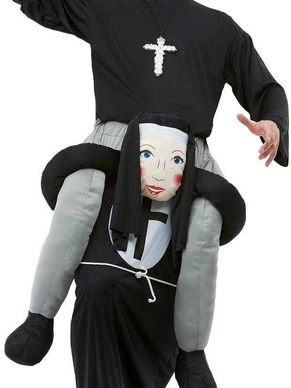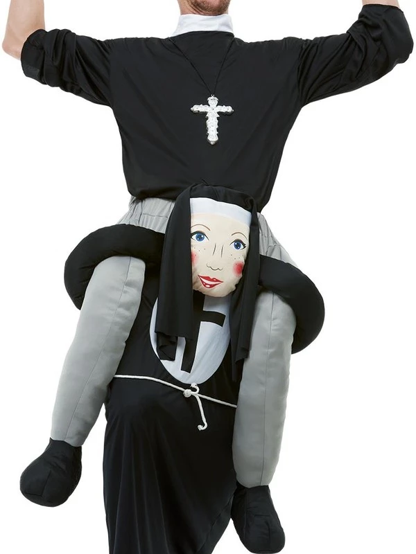Achterop de rug van een Non dansend de dansvloer op met dit geweldige Piggyback Nun Kostuum. Dit kostuum bestaat uit één geheel. Wij verkopen nog veel meer te gekke Piggyback Kostuums voor Carnaval, Halloween, Oktoberfest of Vrijgezellenfeest.