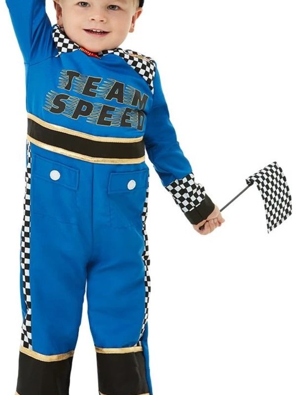 Ben jij ook zo een racefan? Shop dan dit geweldige Toddler Racing Car Driver Kostuum, bestaande uit de blauwe racing jumpsuit, pet en vlag.
