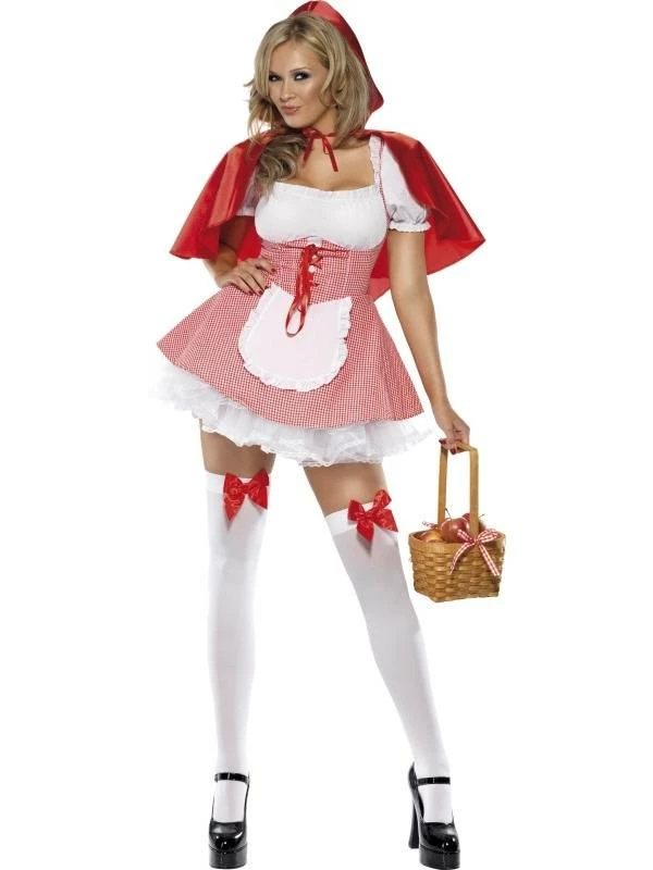 Roodkapje Dames Kostuum, bestaande uit het jurkje met schortje en de rode cape. Maak de look compleet met een bijpassende pruik en de kousen. Leuk voor Carnaval, Themafeestje of Musical.