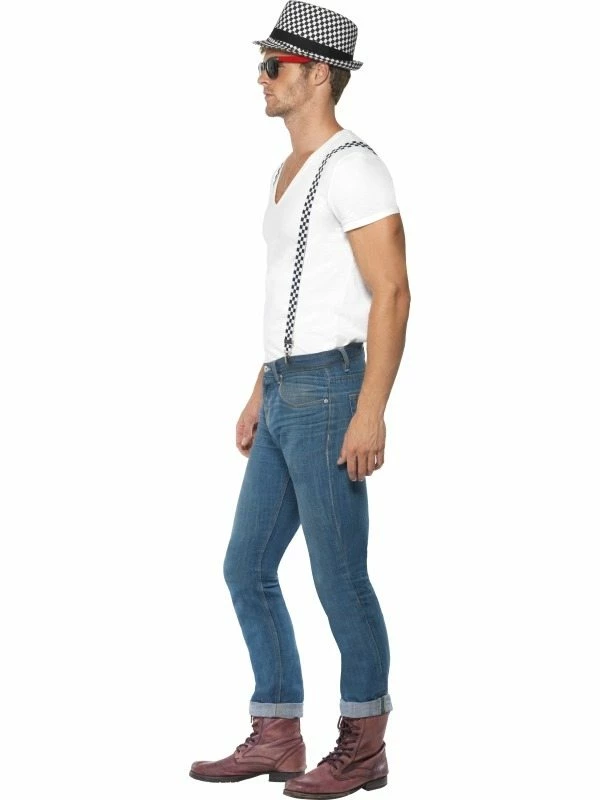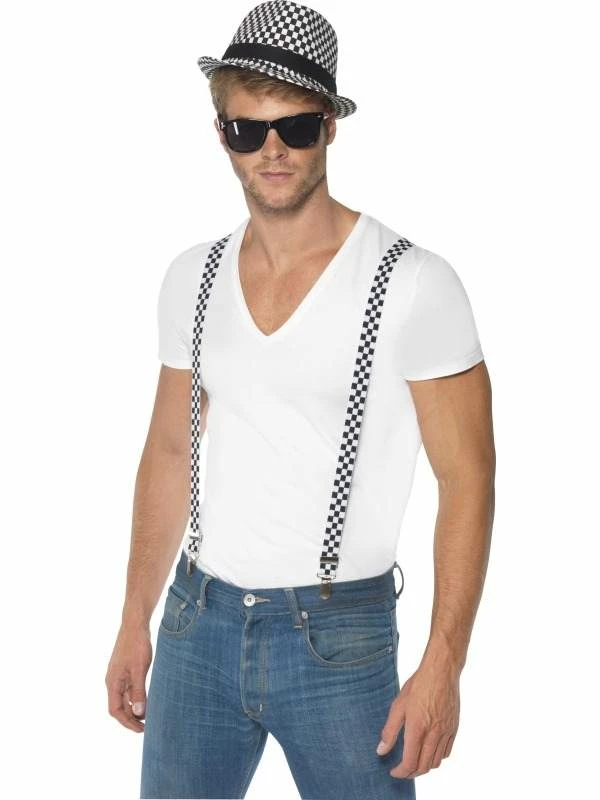 Ska Two Tone 2-delig Verkleedsetje. Inbegrepen is de zwart/wit geblokte hoed en de bretels.
