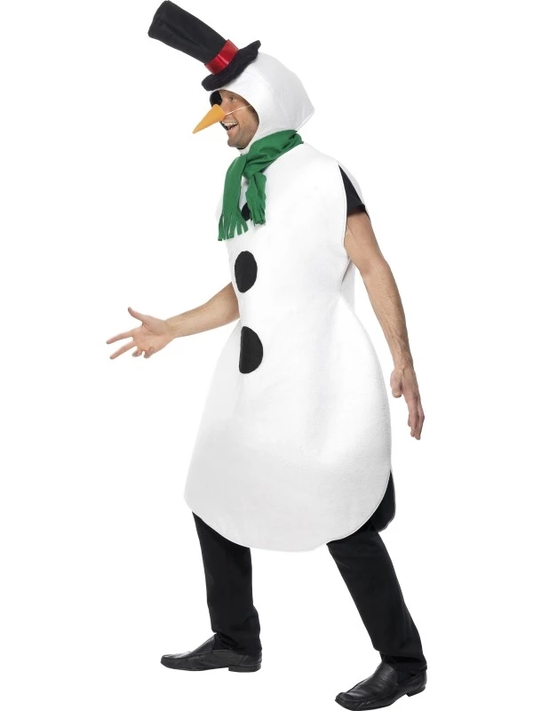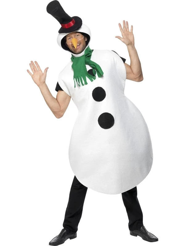 Sneeuwpop Heren Kostuum – compleet Sneeuwpop kostuum, inclusief sneeuwpop bodysuit, hoed, sjaal en wortelneus.