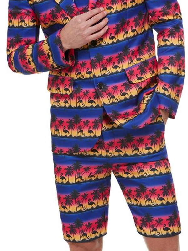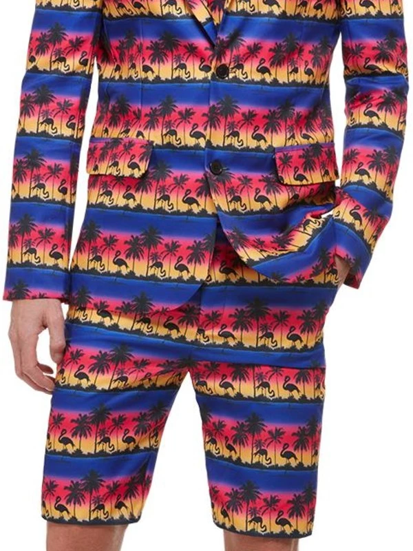 Deze Sunset Flamingo Suit is hét perfecte outfit voor een Beach/Summer Party. Dit kostuum bestaat uit het jasje en korte broek met allover palmbomen en flamingo print.