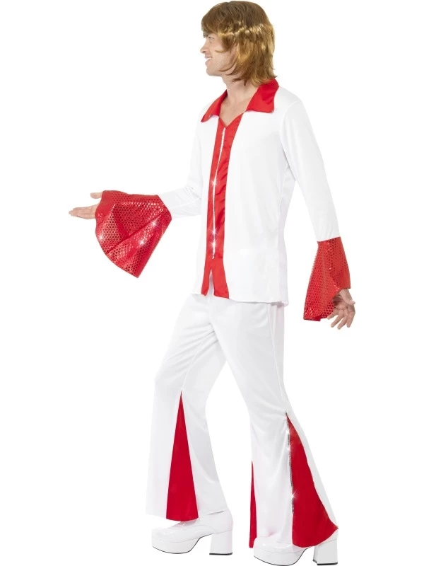Te gek Seventies Abba Kostuum: Super Trooper Abba Heren Kostuum met rood wit shirt met uitlopende mouwen en wit rode broek met wijde pijpen. De pruik verkopen we lost. Te gek seventies kostuum voor themafeesten of carnaval.