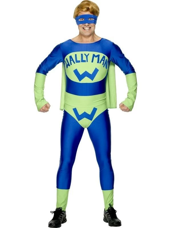 Wallyman Heren Verkleedkleding. Superheld Wallyman met blauw/rode jumpsuit, onderbroek, sokken en oogmasker. Compleet kostuum.
