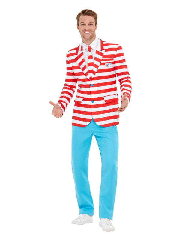Where’s Wally? Suit, bestaande uit het rood/wit gestreepte jasje met blauwe broek en bijpassende stropdas. Leuk te combineren met het Where’s Wally Wenda Kostuum.