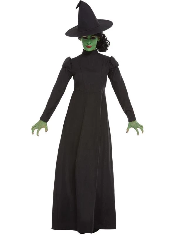 Wicked Witch Kostuum, bestaande uit de lange zwarte Heksenjurk met hoed. Maak de look compleet met onze groene schmink. pruik en nagels en je bent klaar voor Halloween.