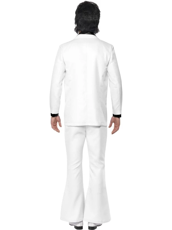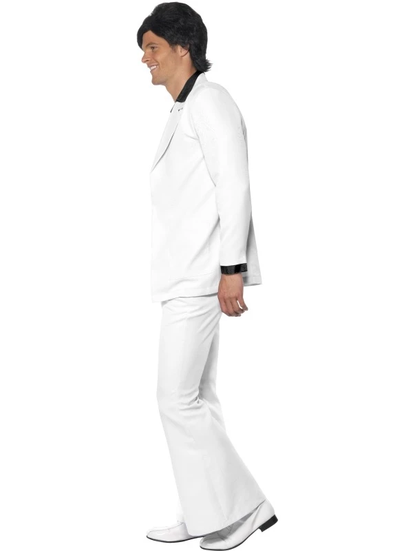Compleet Wit 1970’s Disco Heren Verkleedkostuum. Inbegrepen is de witte broek met wijde pijpen, het bijpassende witte jasje en gillet en het zwarte mock shirt. Compleet kostuum voor Seventies Disco Feesten en Carnaval. We verkopen bijpassende accessoires.