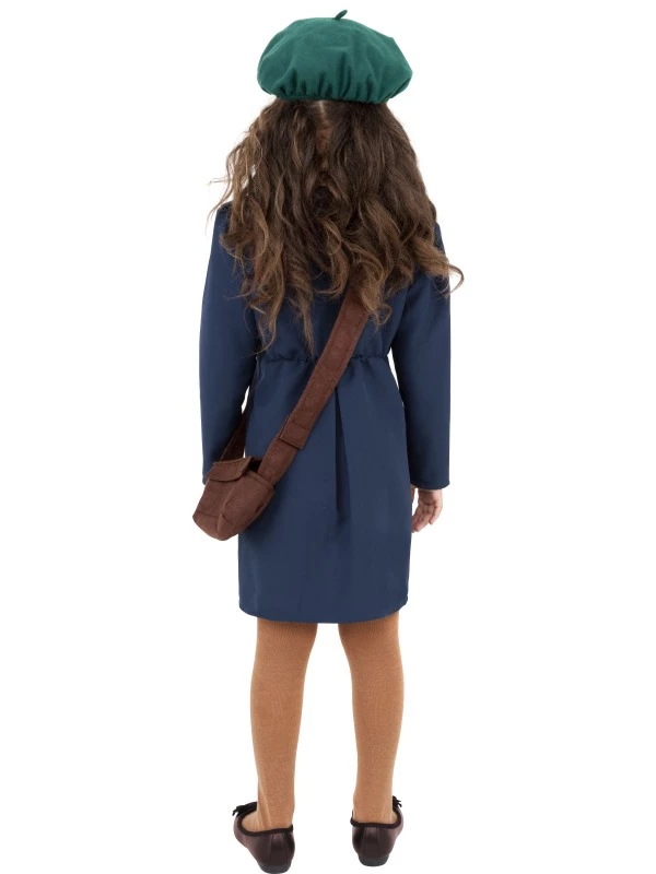 World War II Evacuee Girl Kostuum, bestaande uit de blauwe jurk met hoed en tasje.