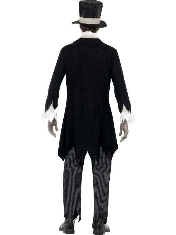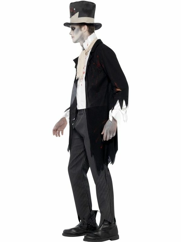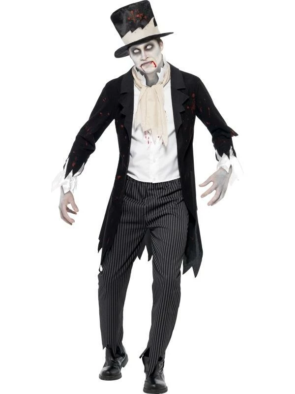 Zombie Bruidegom Halloween Heren Kostuum. Inbegrepen is het jasje met gillet, het sjaaltje, de broek en de hoge hoed (met bloedspatten op het hele kostuum). De accessoires verkopen we los met hoge kortingen tot wel 50%.