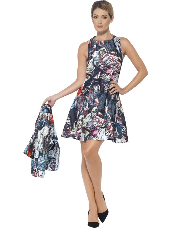 Nu ook leuke nette Dames Suits Verkleedkostuums 2-delig met een mooi vallende jurk met korte mouwen en een net jasje. Dit kostuum heeft een all over zombie print jurk en een all over zombie print jasje. Mooie kwaliteit en toch een scherpe prijs bij 123partyshop. Leuke verkleedkleding voor een van de vele Halloween Feesten Halloween Optochten of voor Carnaval of een andere themafeest. We verkopen ook nog nepwonden en nepbloed om je outfit toch een gruwelijke look te geven.