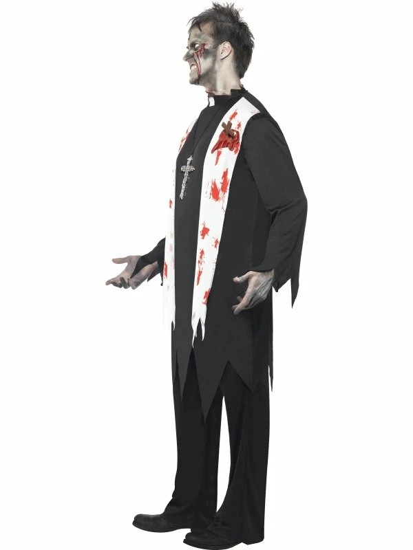 Zombie Priest Halloween Horror Heren Kostuum, bestaande uit het het shirt en de broek, witte sjaal met bloedspatten en latex wond met kruis en de priesterkraag. Maak de look compleet met bijpassende schmink.