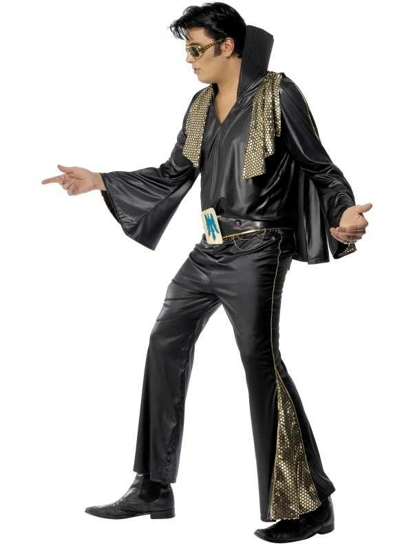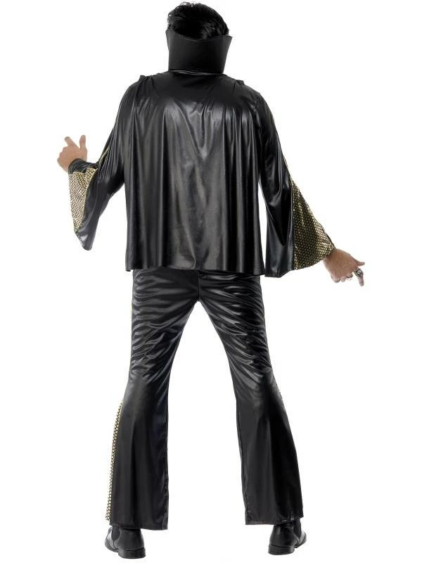 Elvis Kostuum in de kleur zwart met goud. Het complete Elvis kostuum zwart/goud voor heren bestaande uit de broek, shirt, cape en de riem.